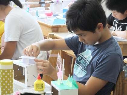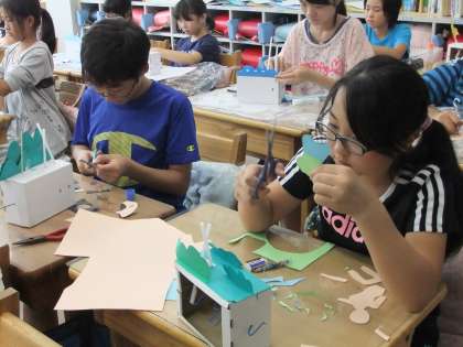 海を泳ぐ魚や大空を飛ぶ鳥、サッカーをする人、太鼓など、子どもたちの様々な発想が形になっていきました。自分の作品を完成させようと、熱心に作業することができました。