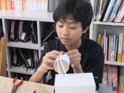 図工の時間に、ハンドルを回すとクランクの働きで上下に動くしくみを使って動くおもちゃを作りをしました。