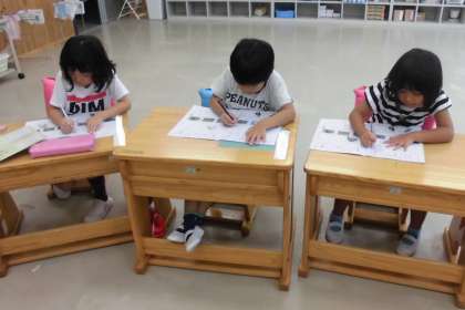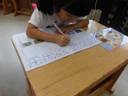 1学期には、ひらがなの練習を頑張ってきましたが、2学期はまず、カタカナの学習です。新しい学習にとても興味をもって取り組んでいる子どもたち。ご家庭でも、ていねいに書き順正しく書けているか、ぜひ見てあげていただけたらと思います。