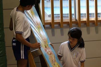 計画委員会は、全校生に活動の様子を知ってもらおうと劇をしたり、写真を使って説明したりしました。
