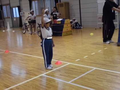 模擬の横断歩道の所では、いったん止まって「右・左・右」の確認。