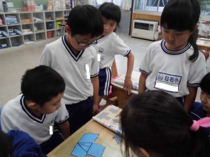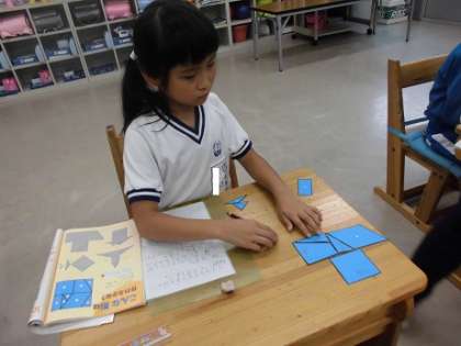 1時間目の今日は、三角や四角の形を組み合わせて、形作りをしました。
