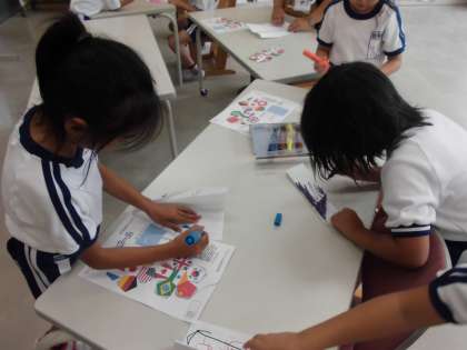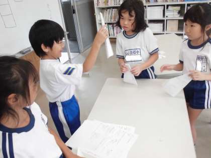 2学期から始めた係活動。今日は紙飛行機大会でした。係のお友達が折り方を説明してくれました。そしてみんなで一斉に飛ばしてみました!高かったり速かったり…。いろいろな紙飛行機ができあがりました。もっと飛ぶように改良したり、色を塗ったりして、とても盛り上がった大会になりました。