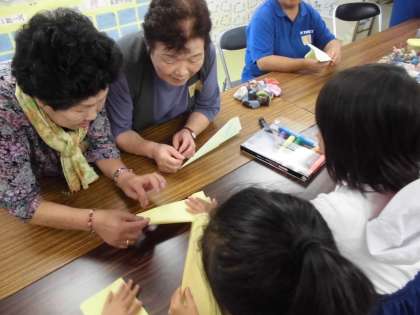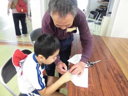 今日は松川仮設におじゃまして、活動を行ってきました。たくさんの方に集まっていただき、とても楽しく交流することができました。まずは紙飛行機からです。子どもたちが教えたり、逆に教えてもらったり…。最後には外でみんなで飛ばして楽しみました。