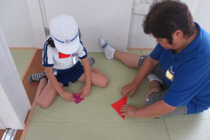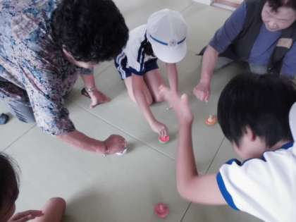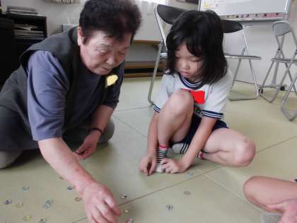 集会所の中では、コマ回し・おはじき・折り紙などもして交流をしました。子どもたちは真剣な表情で遊び方を聞いたり、みんなで競争をしたりして遊びました。集会所の中では賑やかな声が響き渡りました。その声を聞き、「楽しそうだね。何をしてるんだい?」と言って駆けつけてくださった方もいました。