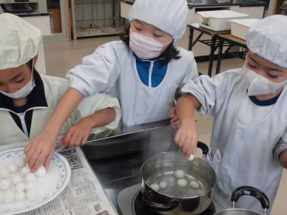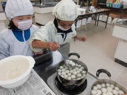 お湯に丸めた団子を入れてゆでる作業です。やけどをしないように気をつけながら、慎重に鍋に団子を入れました。だんだんと浮き上がってくる様子に目を輝かせていました。