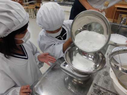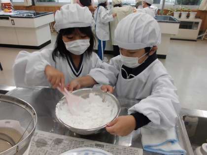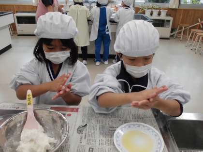 もう1つのグループも力を合わせて頑張りました。粉を混ぜるときには混ぜる人としっかりボウルをおさえる人と、役割をきちんと分担して作業できました。材料を丸める時には、「手でOKを作ったくらいの大きさだよ。」という話を意識しながら作っていきました。