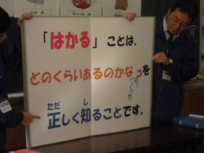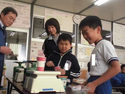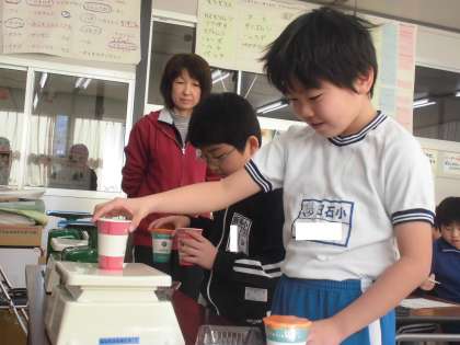 「はかる」いうことのお話しをたくさん聞いて、知識が増えた3年生。次は、見本の100gのコップを持って確かめながら、自分でもおはじき、ビー玉を入れて100gのコップを作ることに挑戦です。「これくらいで100gじゃないかな。」デジタルはかりと指示はかりにのせて重さを量ってみると…「あ〜。おしい!」「うわあ!100g!すごい!」それぞれ、喜んだり、悔しがったり…。2人、100gぴったりのコップを作ることができました。2回チャレンジして記録しました。