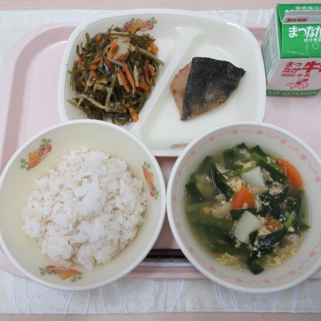 【献立】 麦ごはん ほっけの昆布醤油焼き 切り昆布炒め にら玉汁 牛乳 昆布などの海藻は、ヨウ素や食物繊維が豊富な食材です。ヨウ素は、新陳代謝を活発にしたり、甲状腺ホルモンをつくったりする大切な栄養素...