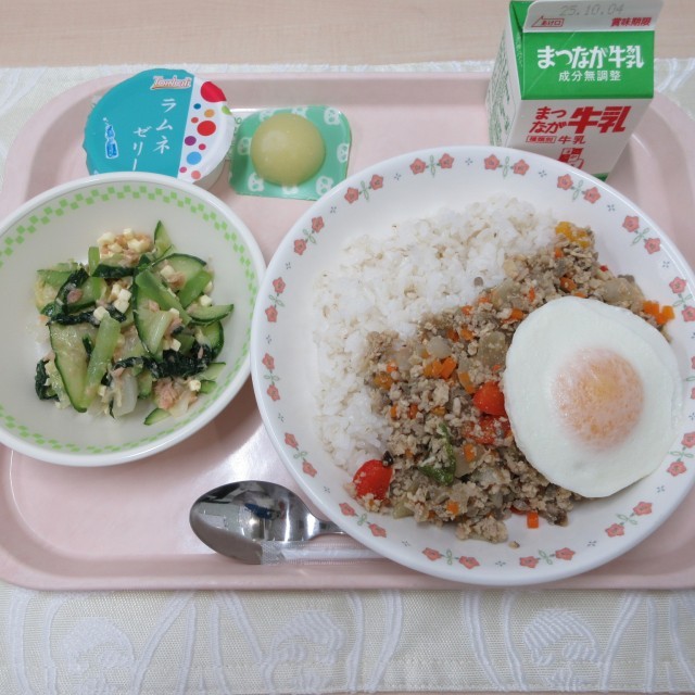 ガパオライス 目玉焼き 小松菜サラダ ラムネゼリー(前期・後期) 一口りんごゼリー(こども園) 牛乳
