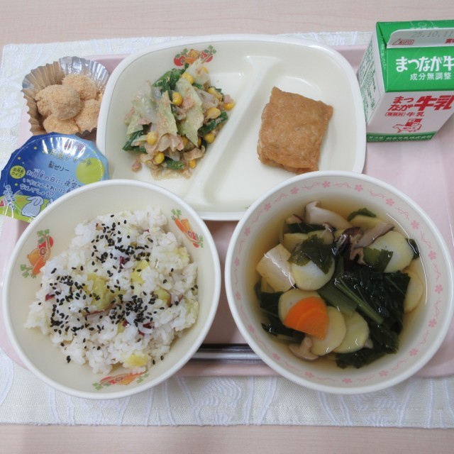 さつまいもごはん きのこ信田 酢味噌和え すまし汁 お月見団子(前期・後期) お月見ゼリー(こども園)