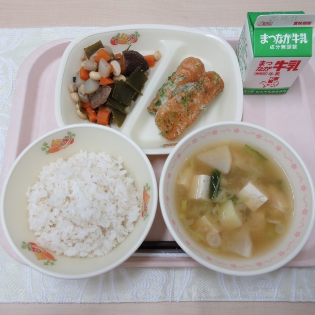 麦ごはん ちくわの磯辺揚げ 五目豆 かぶのみそ汁 牛乳