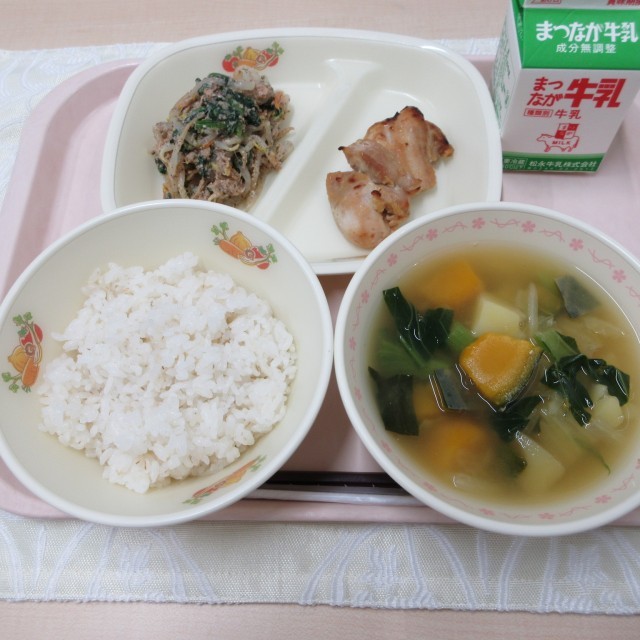 麦ごはん 鶏肉のにんにくみそ焼き じゅうねん和え 飯舘産野菜いっぱいみそ汁 牛乳