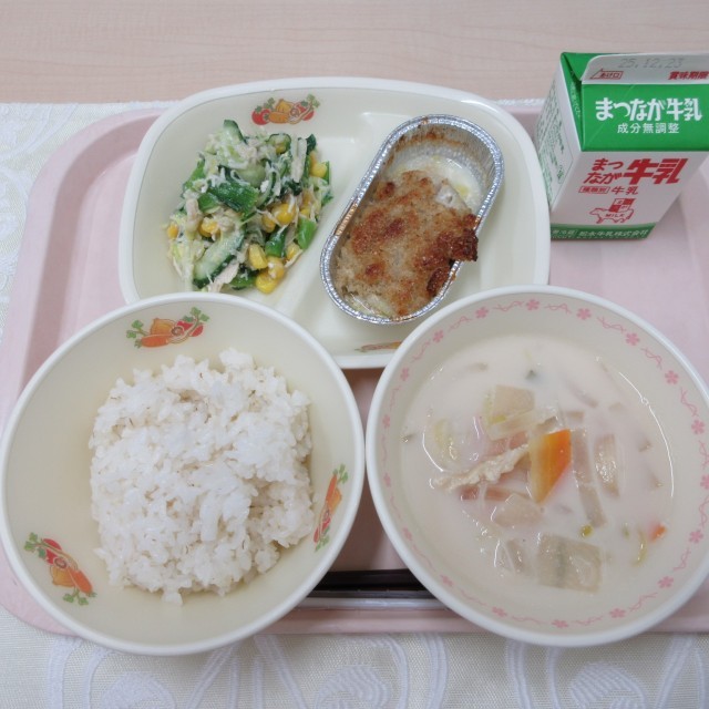 麦ごはん たらのごまマヨネーズ焼き 小松菜と鶏肉のサラダ 野菜たっぷりミルクみそ汁 牛乳