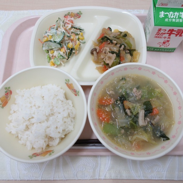 今日の健康応援メニューのスープには、飯舘村産のキャベツとねぎが入っています。生産者の方が、手塩にかけて育ててくれた野菜です。ぜひ大事に食べてほしいと思います。 これからは、朝晩の寒さが一段と厳しくなるので、野菜は、自分を守るために糖分を多く含むようになります。飯舘村産の冬野菜もこれから甘みが増し、ますますおいしくなります。残さず食べてください。