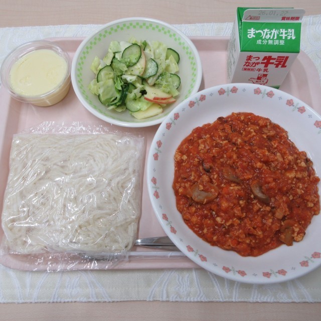 ミートソーススパゲティ りんごフレンチサラダ 手づくりプリン 牛乳