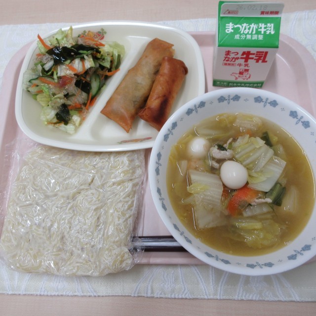 五目あんかけラーメン 凍み餅の春巻き(前期・後期) ミニ春巻き(こども園) 海藻サラダ 牛乳