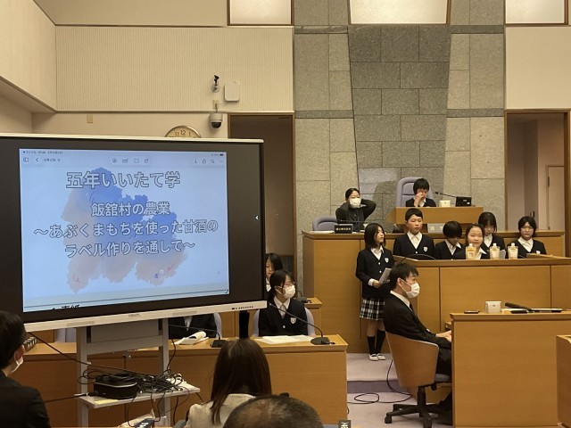 本日、飯舘村役場議場におきまして、飯舘村こども議会が開催されました。4年生から6年生が参加しましたが、実際に「いいたて学」を発表したのは、5年生と6年生でした。発表した全員の生徒が、とても自信をもって立派に発表することができました。飯舘村村長や飯舘村副村長、飯舘村教育委員会教育長から「すばらしい発表でした」とお褒めの言葉をいただきました。
