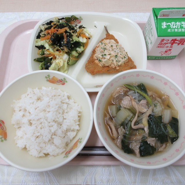麦ごはん アジフライコチュタルソース チョレギサラダ 春雨スープ 牛乳