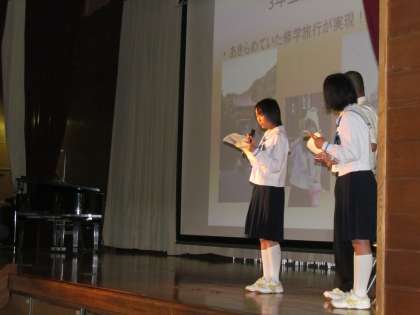 中央中学校の紹介に続いて、いよいよ本校生徒から震災後の経過と被災地の現状について話をさせていただきました。750名もいることを忘れさせるくらい静かに真剣に話を聞いてくれた姿が今でも心に残ります。