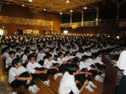 午後3時前に中央中学校に着き、全校生が「ひざつき」で雑巾がけをしているという手入れの行きとどいた廊下を進み、いよいよ全校生約750名の待つ体育館へ…。