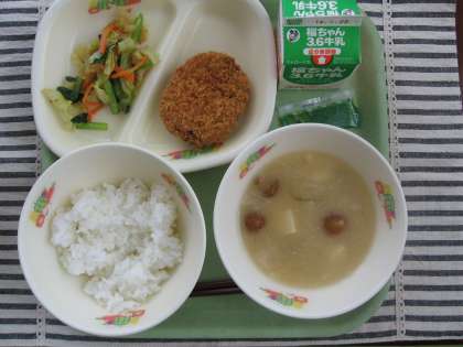 【献立】 御飯 牛乳 なめこ汁 ごぼうメンチカツ おかか和え ソース
