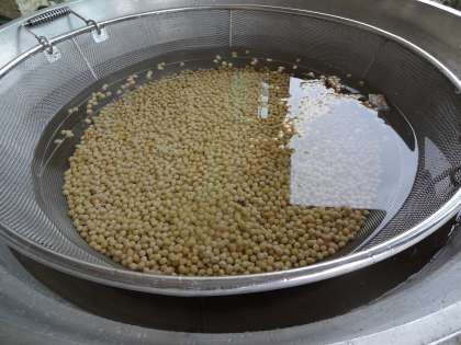 昨日、きれいに洗われた大豆さんたちは、今朝、水をたくさん吸ってぷっくら大きくなりました。