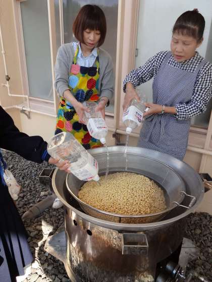 前日作業で豆をつけた水を替えて、大鍋に再度水を入れていきます。いよいよ味噌作り当日の作業にかかります。