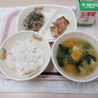 【献立】 麦ごはん 鶏肉のにんにくみそ焼き じゅうねん和え 飯舘産野菜いっぱいみそ汁 牛乳 毎月「飯舘の味の日献立」として、飯舘村産の食品や料理を献立に取り入れています。今日は、結い農園さんのえごまを...