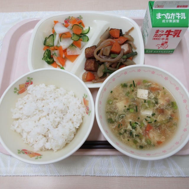 【献立】 麦ごはん 生揚げのきのこあんかけ 磯和え なめこ汁 牛乳 きのこがおいしい季節になりました。今日の献立には、何種類のきのこが使われているのか探してみてください。きのこは、食べ応えがありながら...