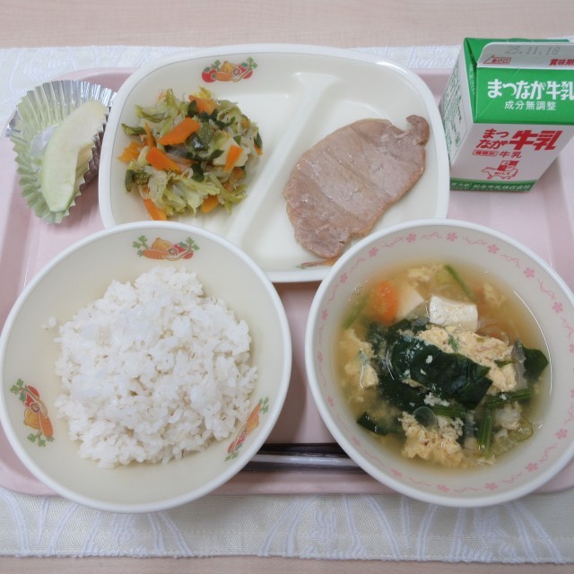 【献立】 麦ごはん 豚肉の生姜焼き 野菜炒め かきたま汁 りんご 牛乳 今週は、「朝ごはんを見直そう週間運動」が行われています。朝ごはんを食べると血液の流れがよくなり、体温が上がります。また、食べ物を...
