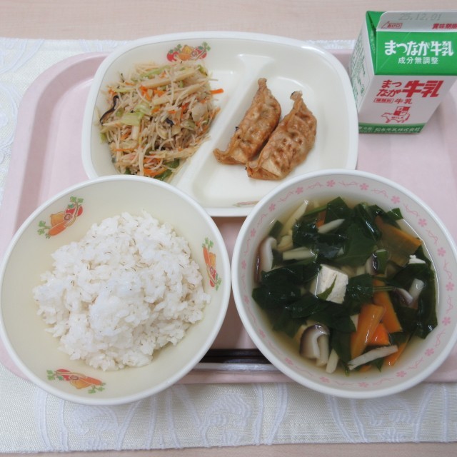 【献立】 麦ごはん 揚げ餃子 五目ビーフン炒め 豆腐と椎茸のスープ 牛乳 きのこは、低カロリーで食物繊維が豊富な食材です。食物繊維の働きは、腸の働きを活発にし、お通じをよくしたり、腸の中の有害なものを...