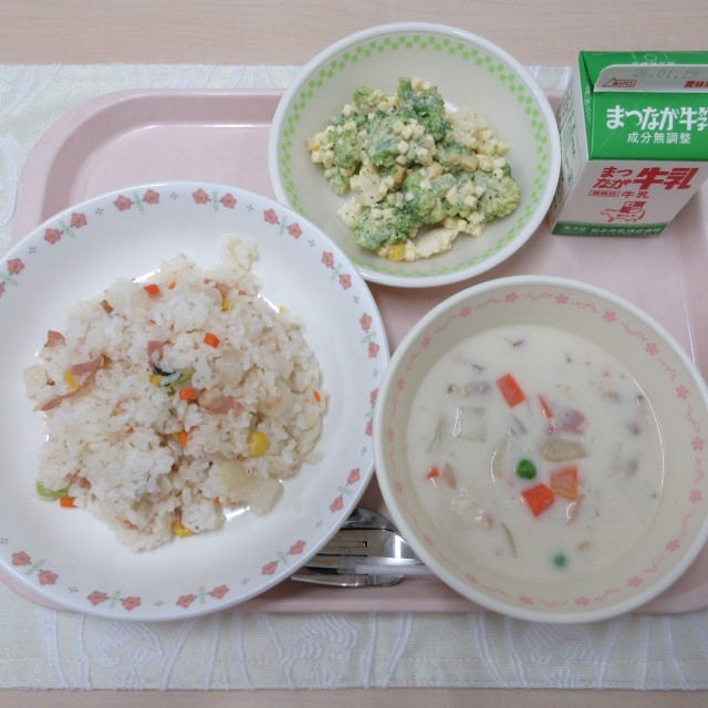 【献立】 大根ピラフ ブロッコリーサラダ クラムチャウダー 牛乳 ブロッコリーにはビタミンCがたっぷり含まれています。ビタミンCは、皮膚や骨、血管を守り、病気に負けない体をつくるのに効果的な働きがあり...