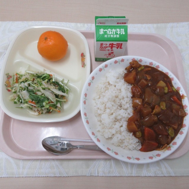 【献立】 冬野菜カレー 水菜と白菜のサラダ ポンカン 牛乳 今日は、全国学校栄養士協議会が学校給食週間の前に、子どもたちが好きなカレーを全国の小中学校で一斉に提供したことから「カレーの日」になりました...