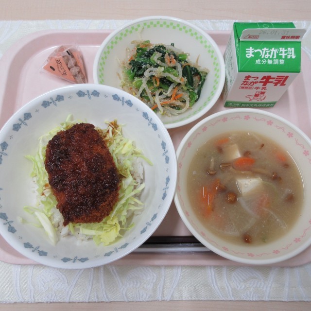 【献立】 ソースカツ丼 青菜のごま和え なめこ汁 まんてん大豆(後期) 牛乳 皆さんは、カツ丼というと、どんなカツ丼を思い浮かべますか?会津でカツ丼といえば「ソースカツ丼」が有名です。ご飯の上に千切り...