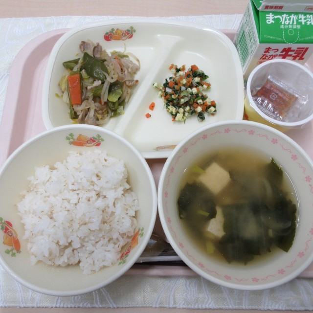【献立】 麦ごはん チャプチェ 切干大根とコーンのサラダ にらのトマトキムチスープ 牛乳 今日の汁物は「ふくしま健康応援メニュー」の一つです。野菜たっぷりで減塩の汁物になっています。福島県民は、野菜不...