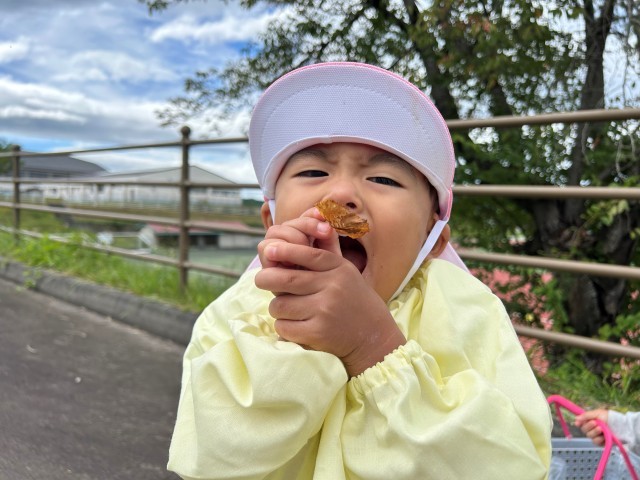 また、散歩でドングリを見つけて拾い集めたり、色づいた葉っぱを地面にこすって音を出してみたりと、自然に興味を持って楽しんでいます。たくさん遊んで疲れたら、ピクニック気分で秋空の下でのおやつタイムは格別です。