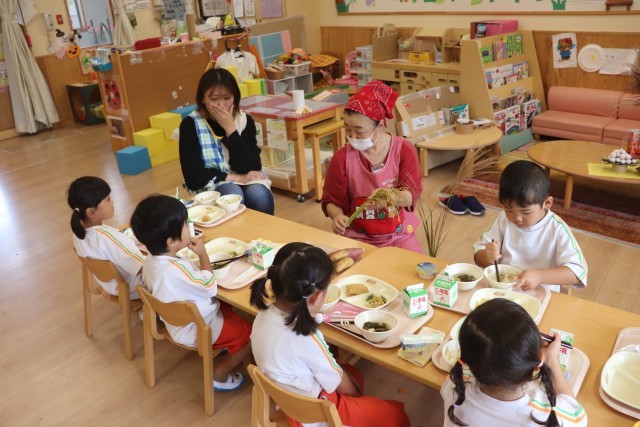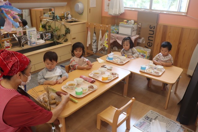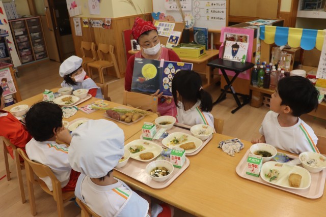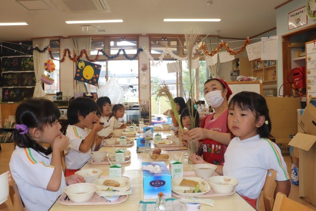 10月6日、十五夜のお月見にちなんだ行事食として、秋に実る栗をいれたご飯やうさぎ型のハンバーグ、さつまいもが入ったサラダ、秋に収穫する野菜をたくさん入れたけんちん汁を提供しました。子ども達には餅米の稲穂を見せながら、「月にはうさぎがいて、お餅をついているといわれているんだよ」と話しました。子ども達は秋いっぱいの給食でお月見気分を味わいました。