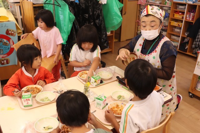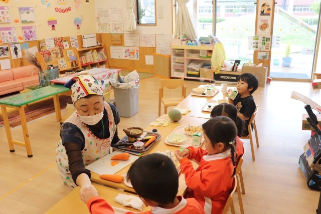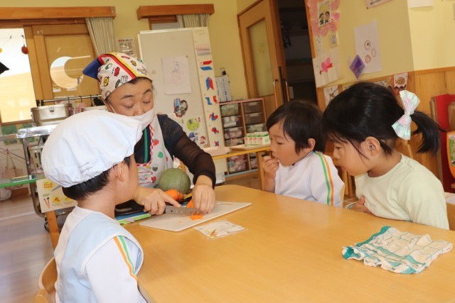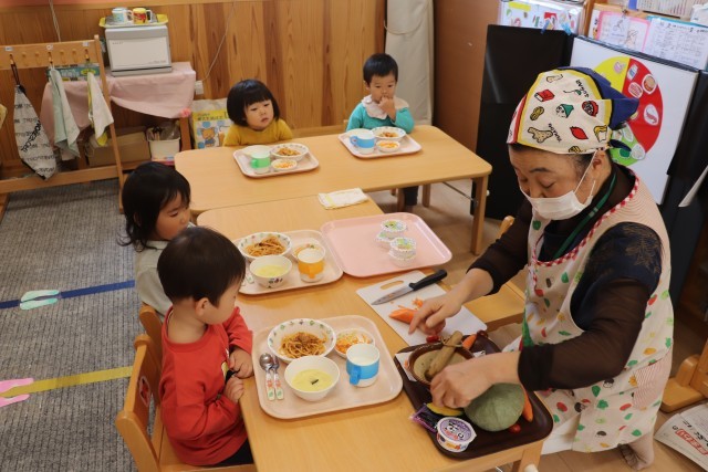 10月10日、目の愛護デーにちなみ、目の健康によいと言われている、にんじん、トマト、かぼちゃを使った献立を提供し、子ども達に入っている野菜を探してもらいました。それらの実物を目の前で切って見せると、においをかいだり、触ったりして、感触を味わっていました。また、みんなが楽しみにしているデザートのブルーベリーゼリーについては、こども園の庭にもブルーベリーの実がなる木があることを知らせると、子ども達も摘んで食べたことや、ジャムでパンにつけて食べたことなどを話してくれました。