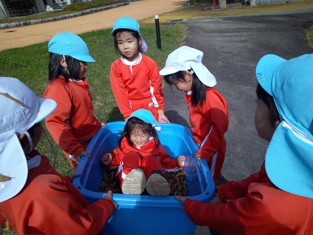 友達と考えを出し合いながら、落ち葉のプール遊びやドングリのころがし遊び、木の実や木片を使ったトトロの人形、ケーキ作りなど、秋の自然を取り入れた遊びを楽しんでいます。