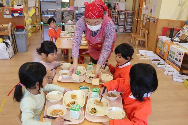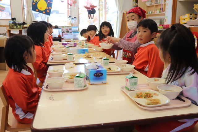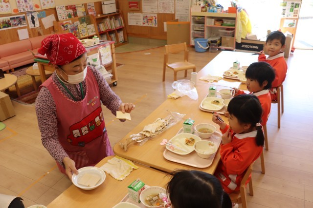 11月4日、以上児の給食に「凍み豆腐の蒲焼」が提供されました。飯舘村でも昔から凍み豆腐が作られていることを伝えました。他にも凍みらせて作る「凍み餅」や「凍み大根」があることを話すせると子ども達の中には「知ってるよ」と教えてくれる子もいました。