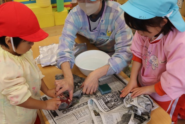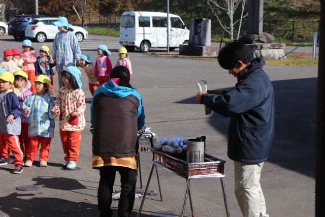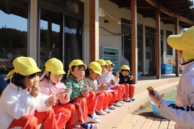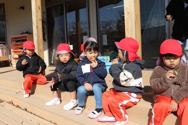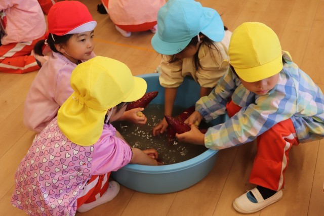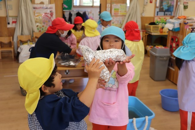 11月7日、自分達で苗から育てたさつま芋を焼き芋にして、パーティーをしました。子ども達は、1本1本丁寧に洗い、新聞紙とアルミホイルで包んで焼いてもらいました。できあがった焼き芋はテラスに座ってみんなでおいしくいただきました。子ども達は「甘くてあったかくて、おいしい」と笑顔いっぱいでした。