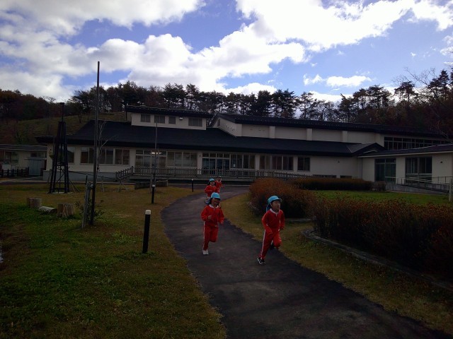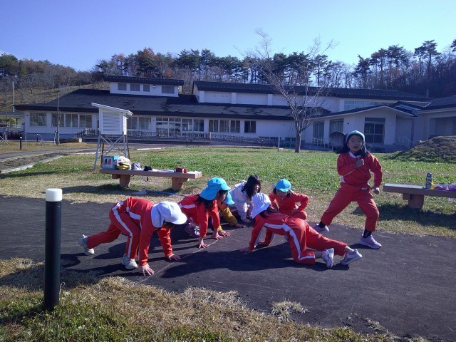 気温が低くなってきましたが、友達を誘って、鬼ごっこやマラソンをして体を動かしたり、落ち葉で温泉ごっこや焚火で焼き芋ごっこ遊びをしたりと元気いっぱいのそら組です。マラソンをしているうちに、「ニュースで見た!」と言って、クラウチングスタートの仕方を教え始める子がいて、熱心にやり方を聞きながら楽しんでいました。
