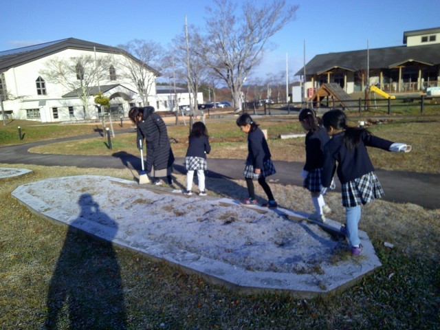 初雪が降った日の朝には、新雪に足や手形をつけたり、触ったりして大喜びで感触を楽しんでいました。また、ビオトープに氷が張っていることに気付き、早速、定規で氷の厚さを測る姿も見られました。これから冬の自然にたくさん触れ、不思議さや面白さを全身で味わっていきたいと思います。