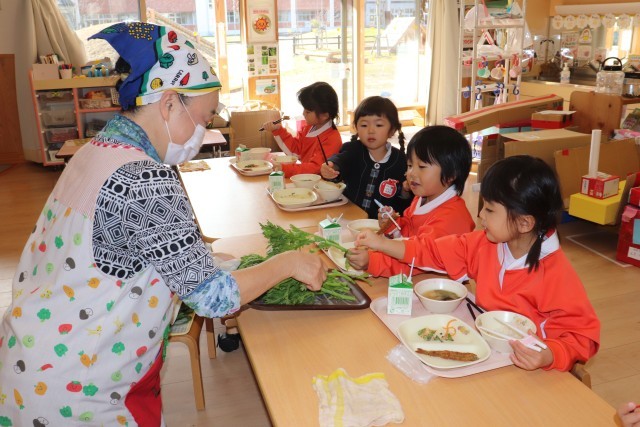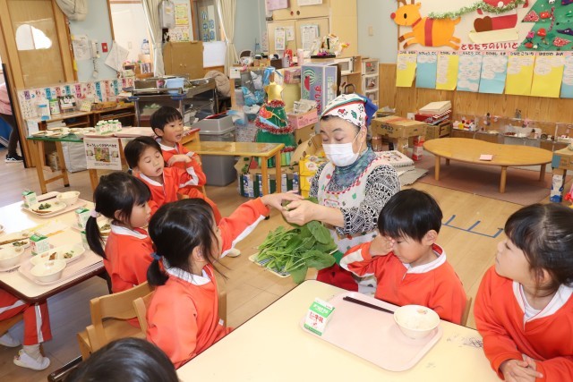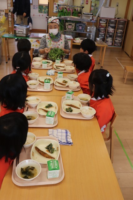 11月28日の以上児の給食に「春菊のごま和え」が提供されました。春菊は、姿も味も個性の強い青菜なので、その姿を見てもらおうと実物を準備しました。「春菊はその名のとおり春に菊の様な黄色い花を咲かせます。園庭の菊にはっぱの形も似ています」というと「よもぎみたいだね」と気付く子もいました。またいつも食べている「ほうれん草」も見せると、早速匂いをかいで、なぜか「すいかの匂いだ~」や「梨のにおいだ~」と盛り上がりました。