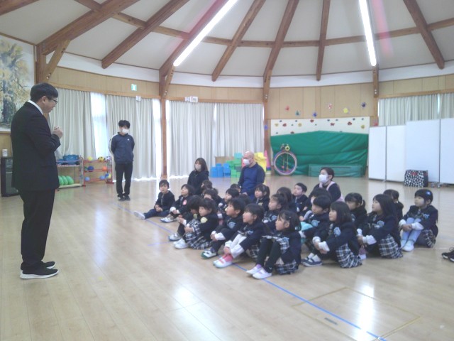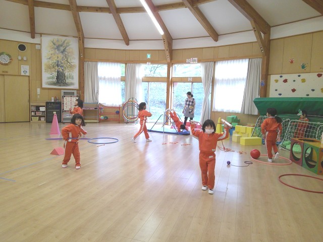 冬休みに入り、以上児は3学級合同で過ごし、異年齢児との交流を楽しみながら生活しています。5歳児が自分の目標に向けてなわとびやフラフープなどに挑戦している姿に刺激を受け、3、4歳児もうんどう遊びを挑戦しています。