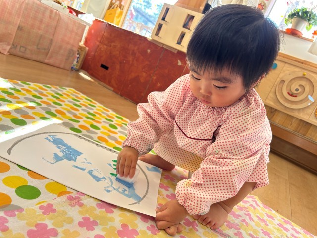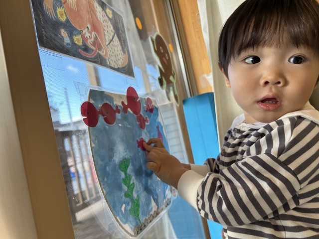 先生をと一緒に読んだり、友達と一緒にページをめくって、「ここー!」と得意げに金魚を見つけて指さしています。そこで、保育室にも金魚を逃がして隠してみることに・・「どこだー?」とキョロキョロ探し回り、見つけた時には「あったぁ!」ととてもいい笑顔。絵の具遊びで「お水をたくさん入れてあげよう」と作った自分の水槽にペタっと貼り付け、「きんぎょ、いたぁ」と満足そうに眺めている子ども達です。