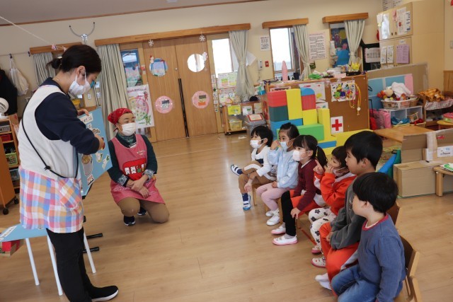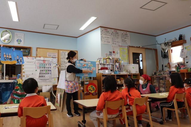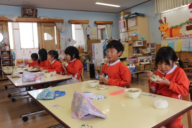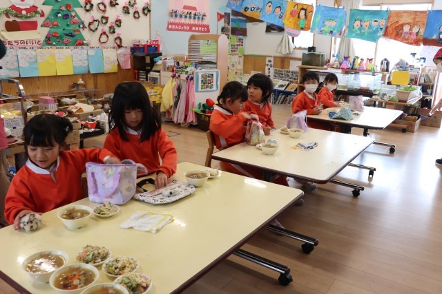12月4日、子ども達と楽しみにしていた「さつまいもパーティー」を行いました。当日は子ども達も調理に参加する予定でしたが、残念ながらインフルエンザが蔓延し、栄養士が調理することになりました。子ども達が行うはずだった調理の行程をイラスト付きで説明し、調理風景をイメージできたようでした。できあがった「さつまいもサラダ」と「さつまいも入り豚汁」をおかわりをして嬉しそうに食べていました。