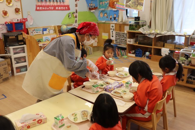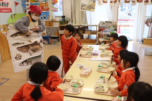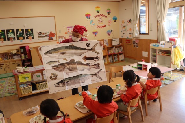 12月18日は以上児の給食に「たらのごまマヨネーズ焼き」が出ましたので、冬の魚「たら」のお話をしました。「たら」は小さい魚をたくさん食べ、おなかがパンパンにふくれていることから、「たらふく食べる」という言葉がうまれた、という話をしました。お家では鍋にすることが多い魚で、フィッシュバーガーの魚も「たら」だと伝えました。生の切り身の皮の柄をみながら、どれが「たら」なのか、皆でポスターの中から「たら」を探しました。