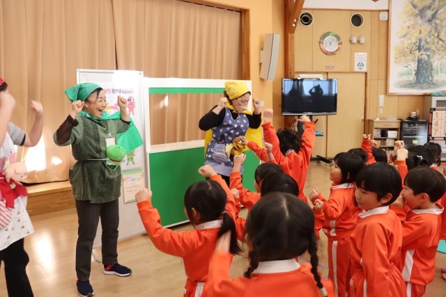 1月14日、「何でも食べて元気な子になって!」とこども園の食育担当(3人)で、人形劇「グリーンマントのピーマンマン」を行いました。これは皆の嫌われ者ピーマンが、のどいたバイ菌・はらいたバイ菌たちをやっつけるというお話です。子ども達はピーマンマンがバイ菌と戦うシーンで特に熱が入り、一生懸命応援してくれました。また野菜のピーマンには、このようなパワーがあるということを知ってもらうことができました。最後に、三つの栄養(たんぱく質・ビタミン・炭水化物)を色分けしたヒーロー(ムキムキレッド・キラキラグリーン・パワフルイエロー)のポーズをして、なんでも食べることを約束をしました。